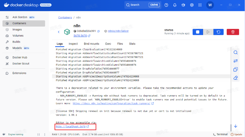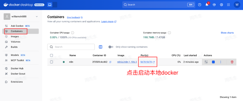 然后打开Docker,就能发现对应的容器了,点击如下链接即可进入n8n的本地端口