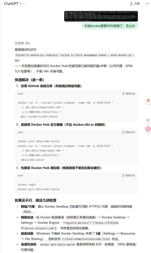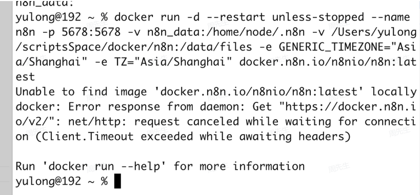 如果报如下错误的话,先确定 Docker Engine 的配置有没有改,改了有没有应用,然后再重试,还是不行的话,把命令最后面 docker.n8n.io/n8nio/n8n:latest 改为 n8nio/n8n:latest 即可。