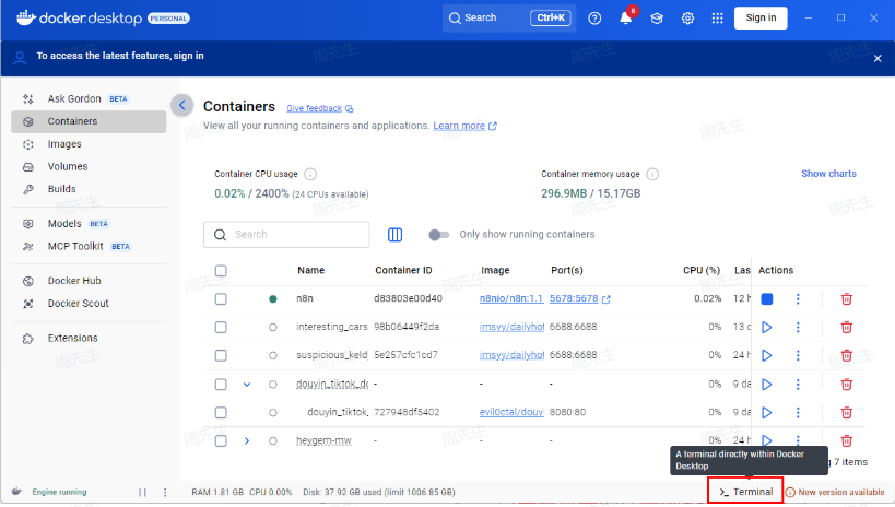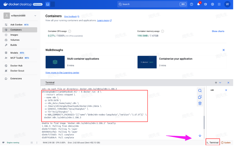 然后在 docker(建议)或teminal 终端窗口里面执行上述命令(创建数据卷和 n8n部署命令)