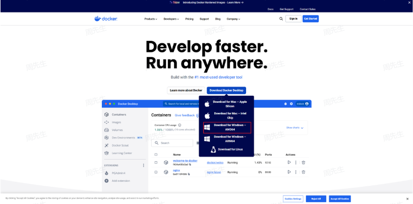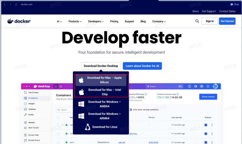 这种方式Mac 和 Windows 的步骤是类似的,下载docker 时注意选择对应的 系统。