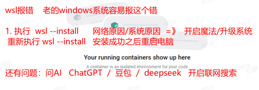 - - 如果docker报错是wsl错误,则在cmd命令行里面执行 wsl --install ,安装后通过命令 wsl --version 查看是否安装成功