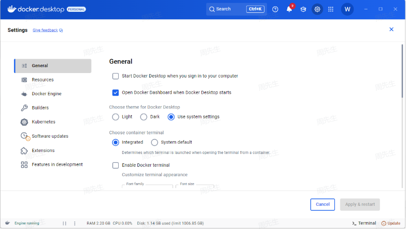 下载安装后重启电脑,打开Docker,打开设置。