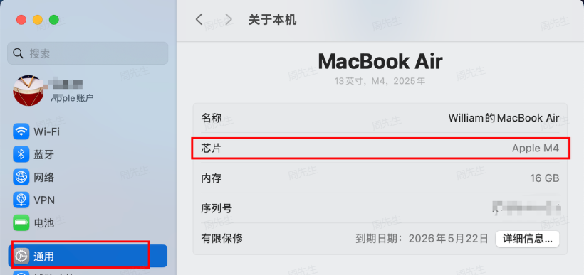 可以在 系统设置—通用 查看,像我这个 Mac m4 就下载 docker第一个版本就可以了。