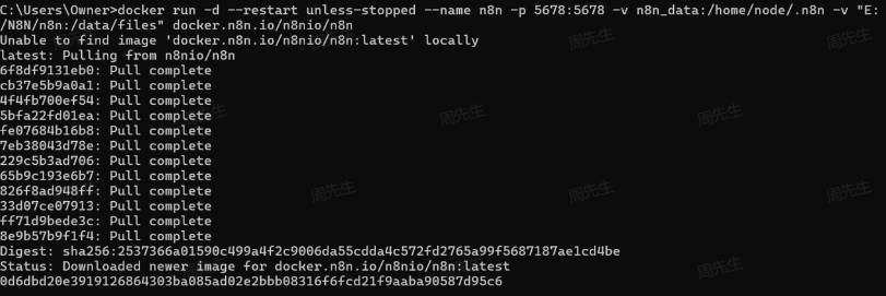 如果是显示下面的内容说明我们的n8n镜像拉取成功。
