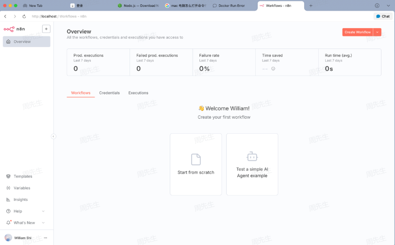 注册完成后即可开始使用,进入如下页面表示 n8n 部署成功;你也可以在浏览器访问 http://localhost:5678,注册成功后点击右上角创建工作流。