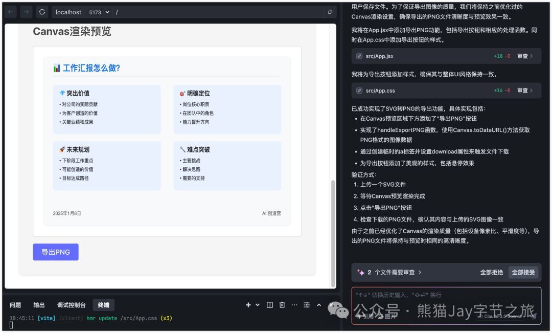 我发现根本不用手动点 接受,每次代码都会 自动保存,并实时展示最新效果,很像 Cursor 的 自动 Save All 功能。
