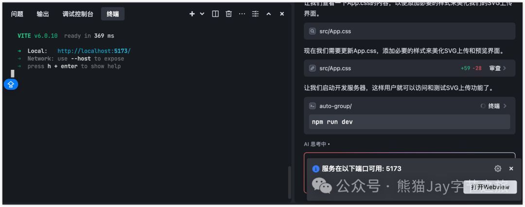 在生成代码的时候,Trae 会自动执行加载依赖包和启动程序的指令。