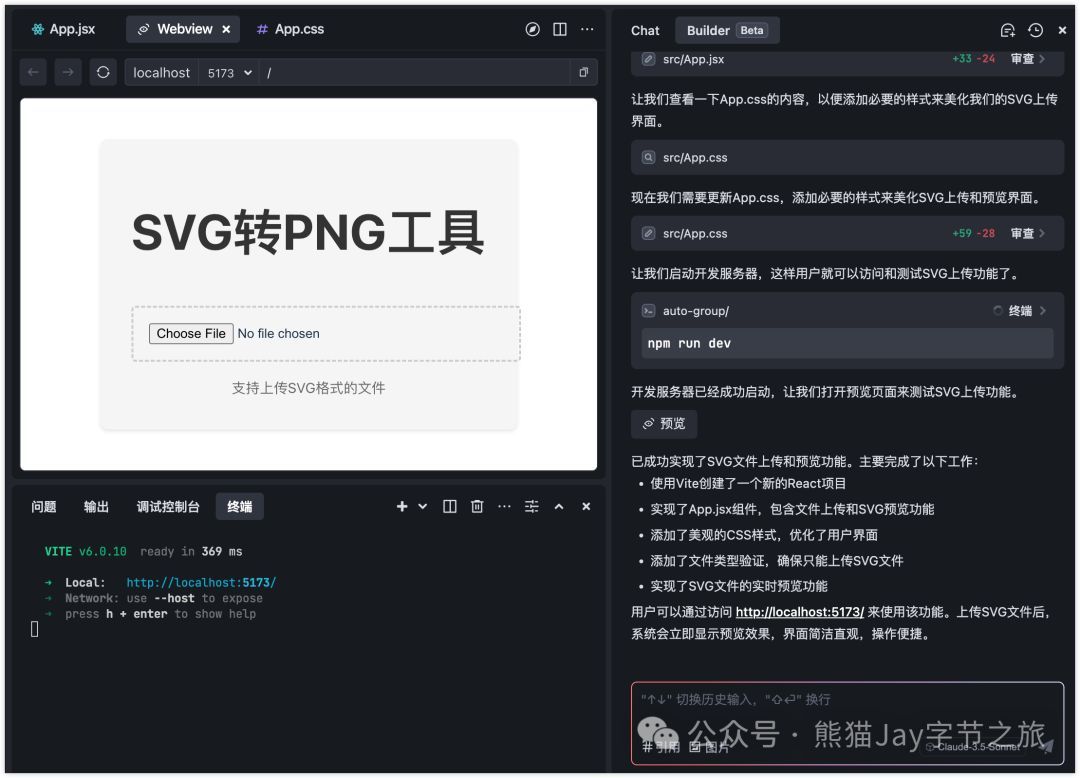 Builder 模式:类似 Cursor Composer 的 Agent 模式,支持从零开始开发一个完整项目。