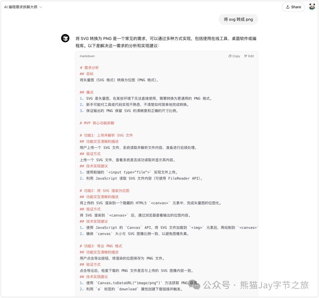 于是打开我的 需求拆解大师,把最简单直白的需求——“将 SVG 转换成 PNG”,丢给 GPT 试试看!