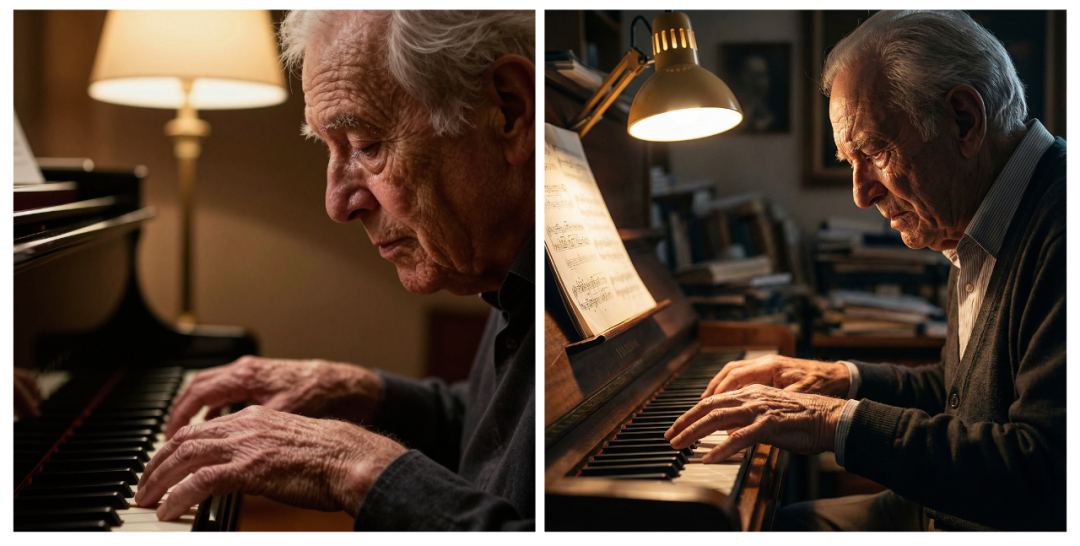 提示词:老年钢琴家弹奏时的侧脸特写,皱纹、泪光与手指动作同步。环境为昏暗琴房,台灯暖光聚焦面部,镜头85mm,f/1.4,捕捉睫毛阴影与指尖力度,8K超清