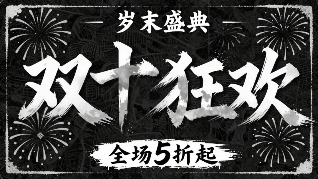 提示词:复古海报,中央大字"双十二狂欢"采用动态书法效果:主标题为行楷风格,笔画连贯流畅,起笔有力果断,飞白技法应用;文字表面覆盖一层半透明墨迹效果,仿佛刚书写完成;背景为深色老宣纸质感,点缀传统烟花图案,采用木刻版画风格;文字边缘呈现自然毛边效果,模拟手工雕刻感;顶部添加"岁末盛典"篆书小标题,底部添加"全场5折起"手写小字说明,整体风格融合传统书法韵味与现代商业气息,黑底白字,高对比度