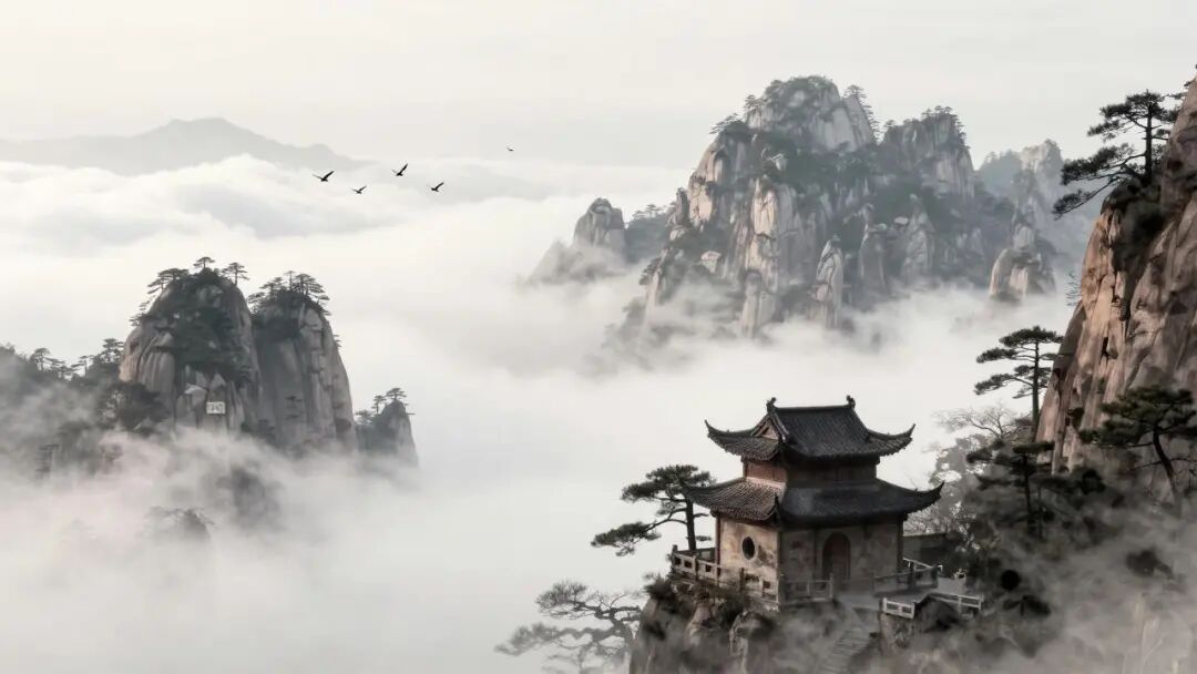 提示词:水墨风黄山云海,飞鸟与古建筑,晨雾缭绕,横版构图