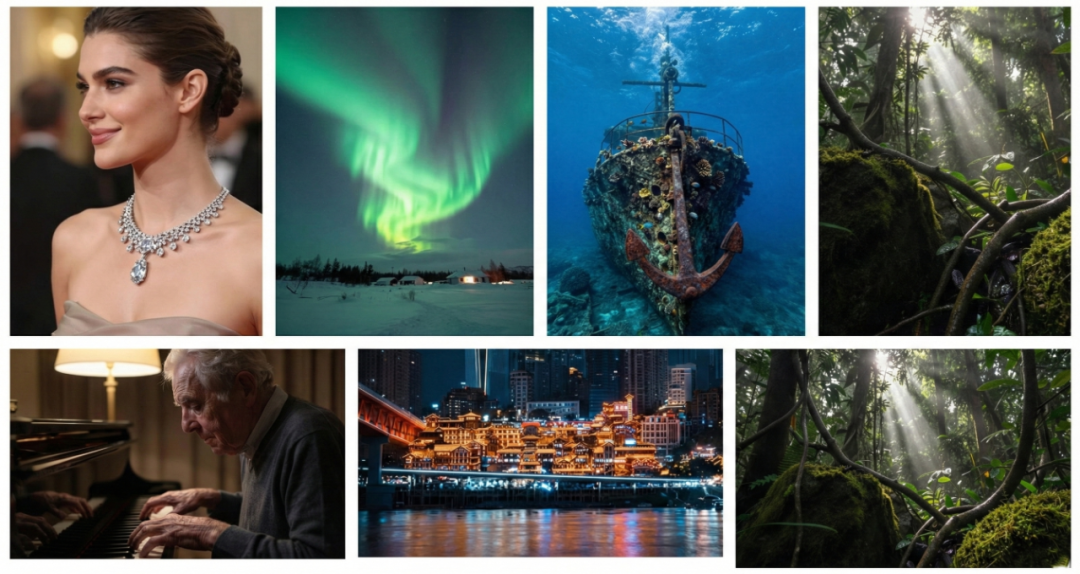 例如,在生成“老人弹钢琴”的图片中,老人的发丝、面部皱纹以及手背的汗毛均清晰可辨,光线处理也十分自然。下面一起来欣赏Z-Image的部分生成作品: