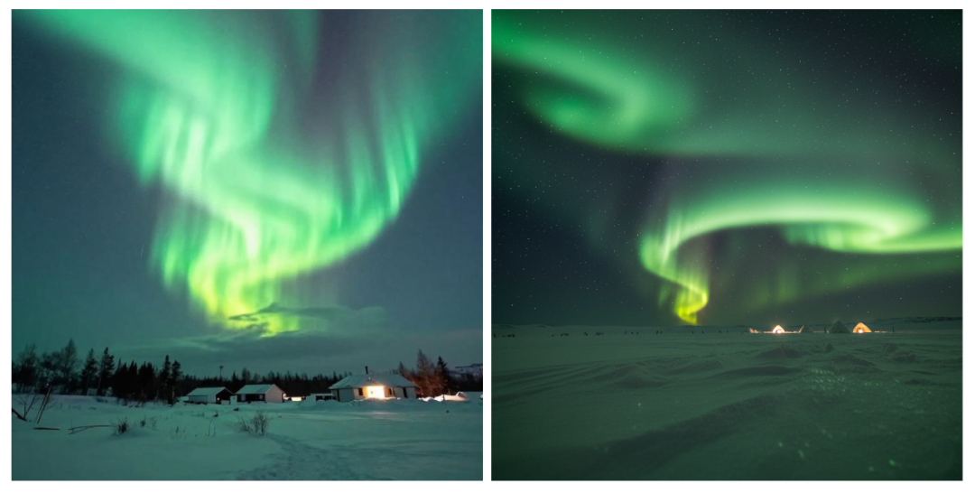 提示词:北极圈冬季极光暴发,绿色光幕如波浪涌动。雪地纹理细腻,远处冰屋灯光微弱,镜头采用赤道仪追踪极光轨迹,ISO 3200,f/2.0,星空细节保留,8K超清