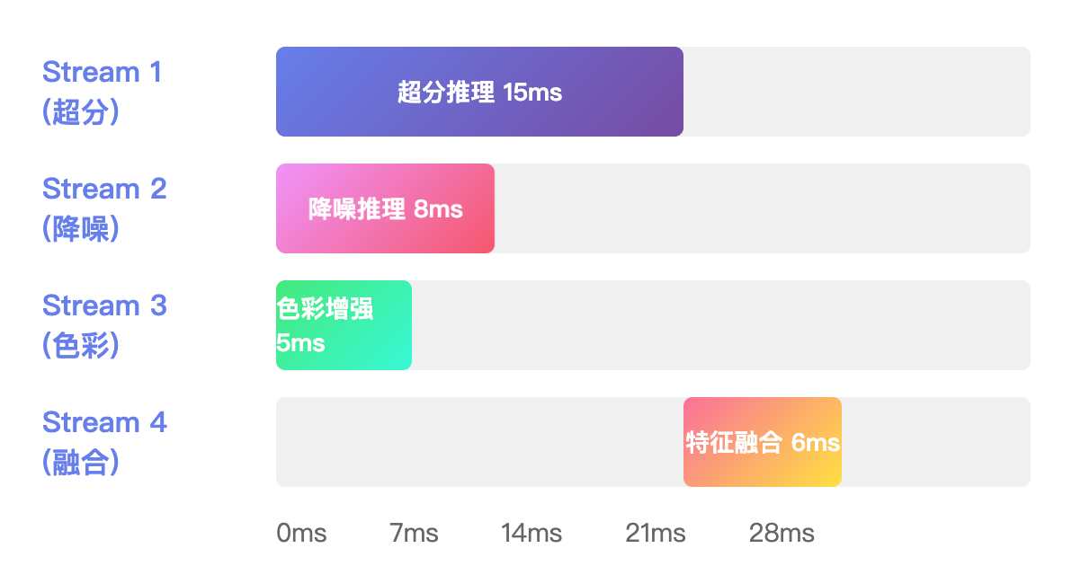 帧级流水线:当第N帧在做超分时,第N+1帧同时进行降噪,第N+2帧进行色彩增强