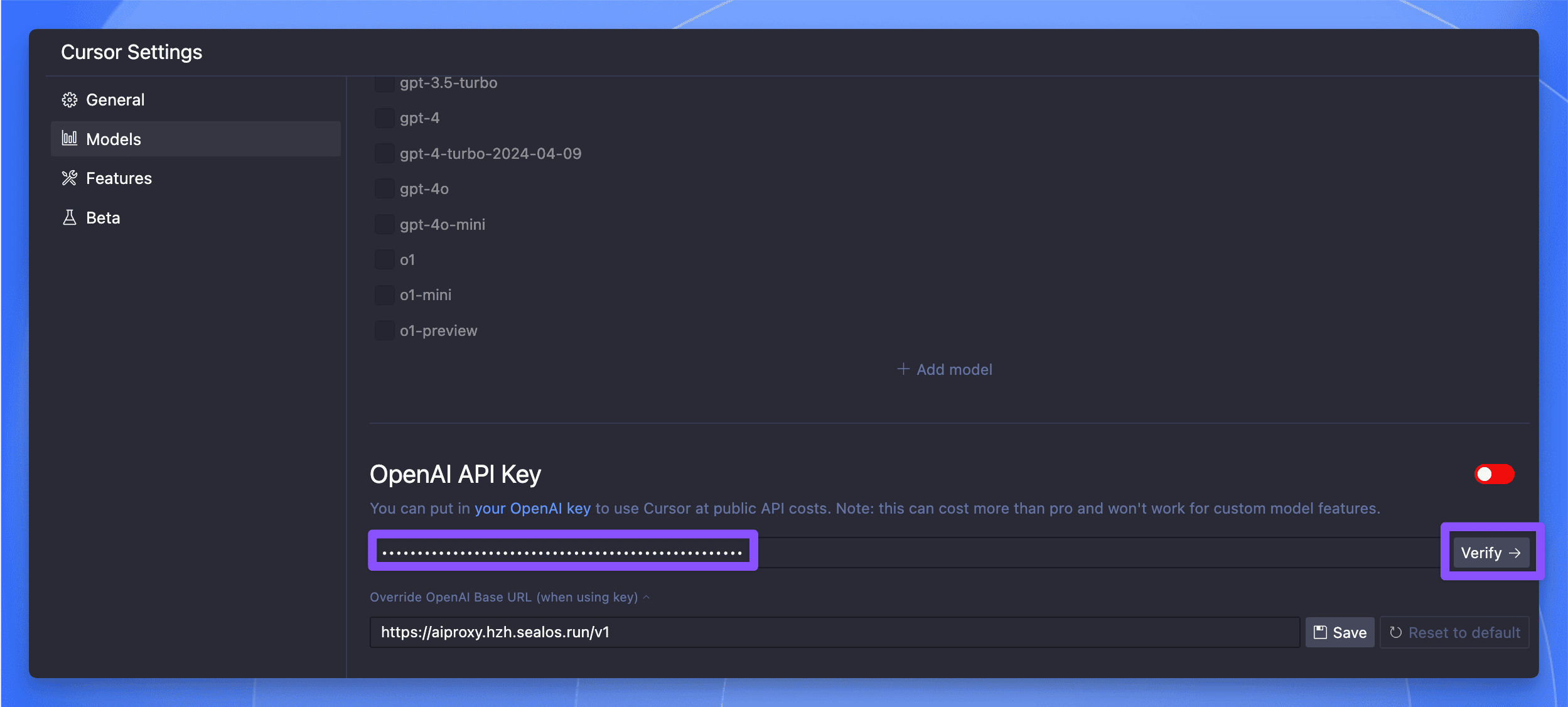 输入之前在 Sealos AI Proxy 中创建的 API Key,然后点击 “Verify” 按钮。