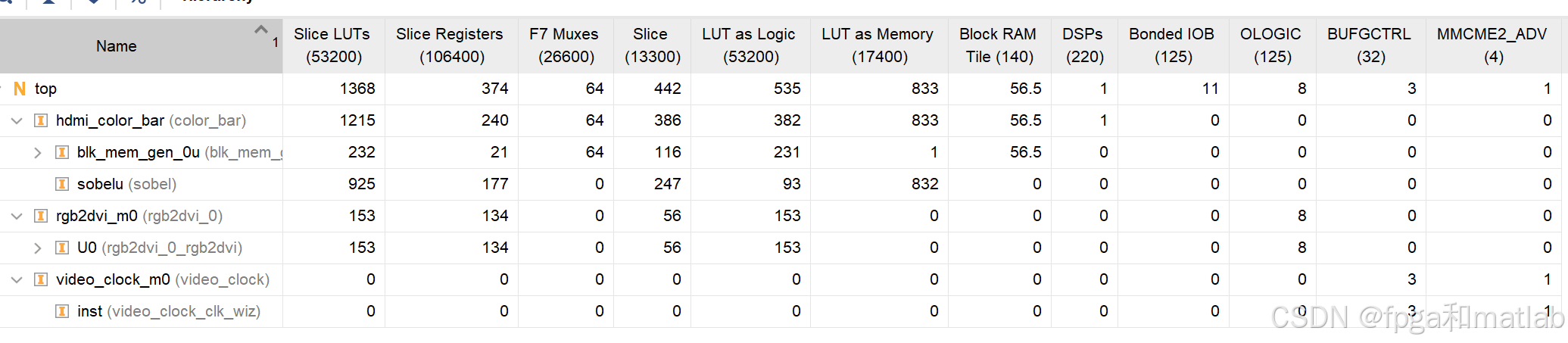 hdmi_color_bar模块:是资源消耗的主要模块,消耗了1215个SliceLUTs和全部的Block RAM(56.5)