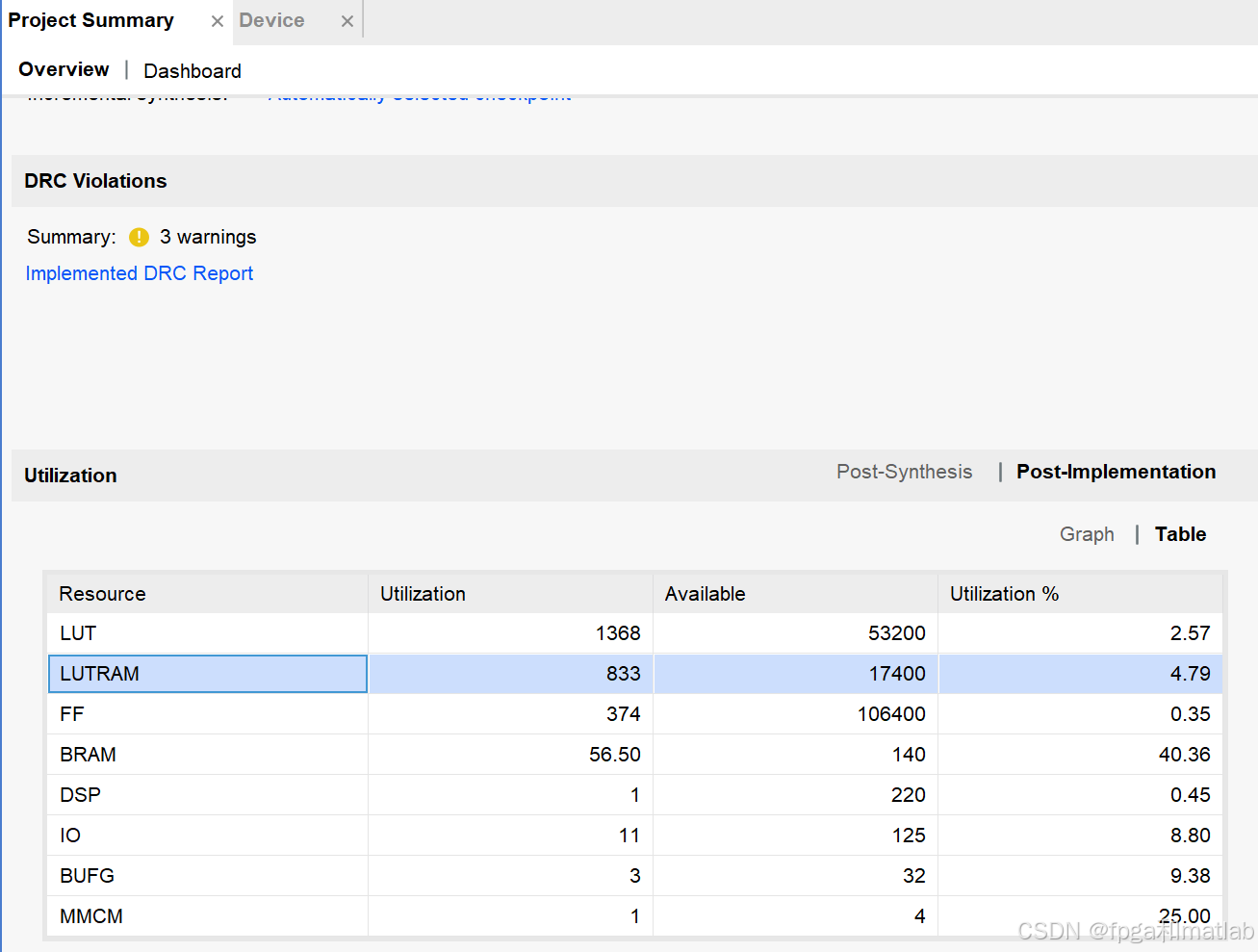 其中blk_mem_gen_0子模块消耗了232 个Slice LUTs