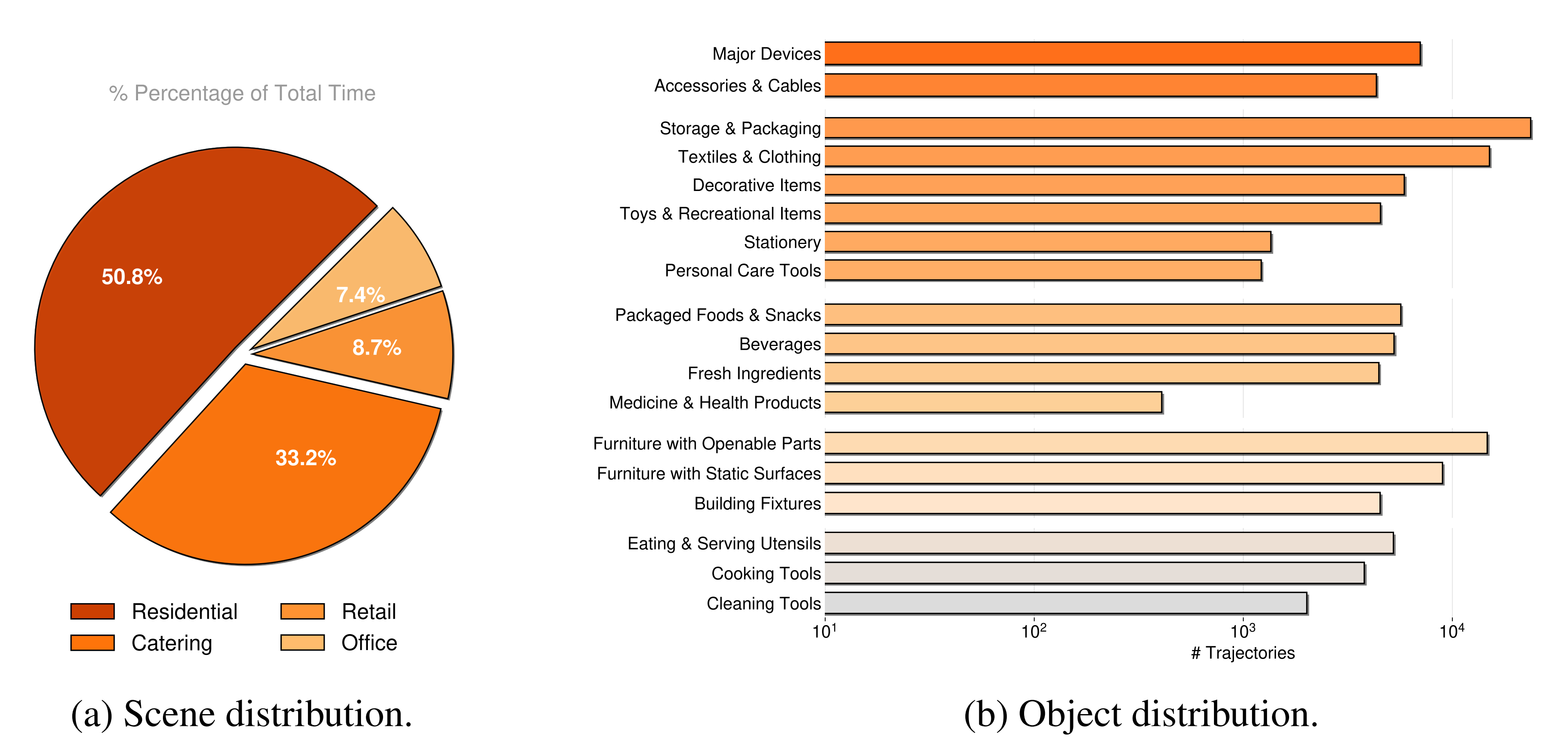 每个场所包含多个操作区域,总计提供50个独特场景。物体集合均来自真实零售供应商,以确保视觉和物理属性的真实性。对于不安全或不便于反复操作的物品(如食物),使用高保真仿制品,以在保持视觉真实感的同时,兼顾卫生与操作效率