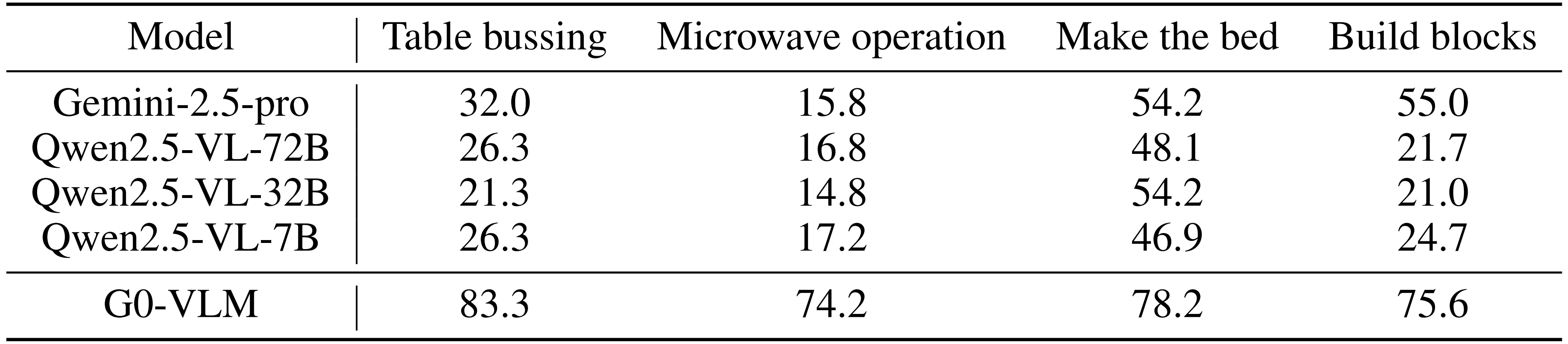 G0-VLM 是双系统中的高级规划器,承担多项职责:解释人类的高层指令、以自然语言进行响应、执行任务规划,并向 G0-VLA 下发低层原子动作指令以供执行