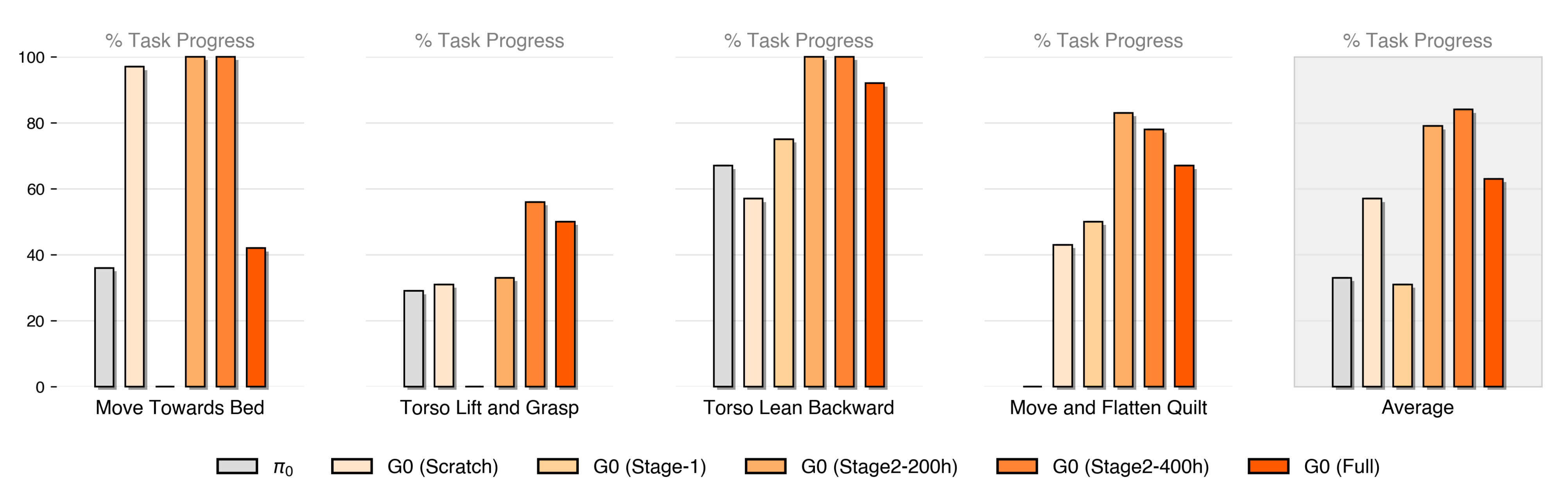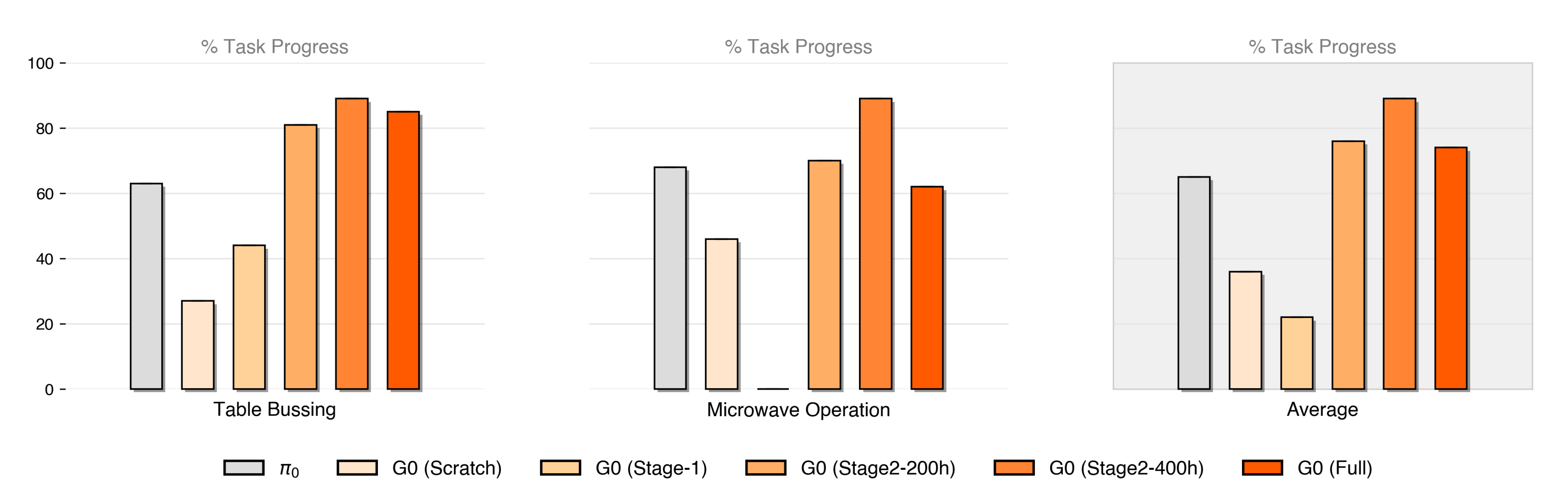 - G0 (Full) :VLA先进行第一阶段预训练,再进行第二阶段预训练(400小时数据)