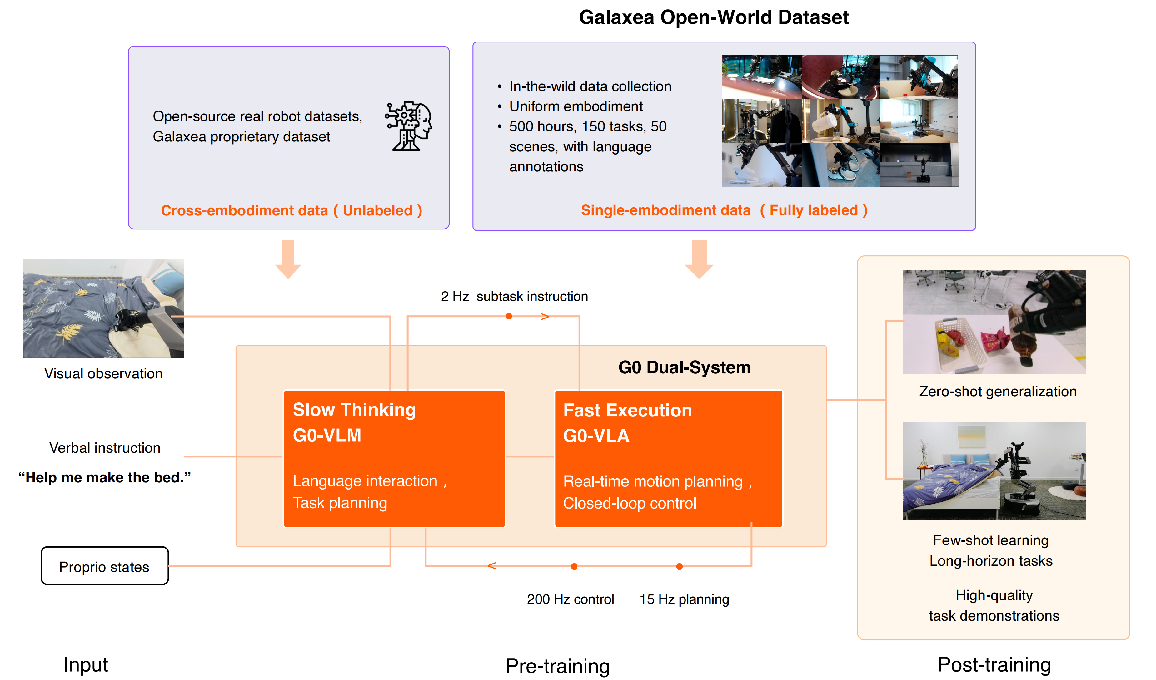 他们的 G0 模型架构建立在机器人领域分层规划的基础之上