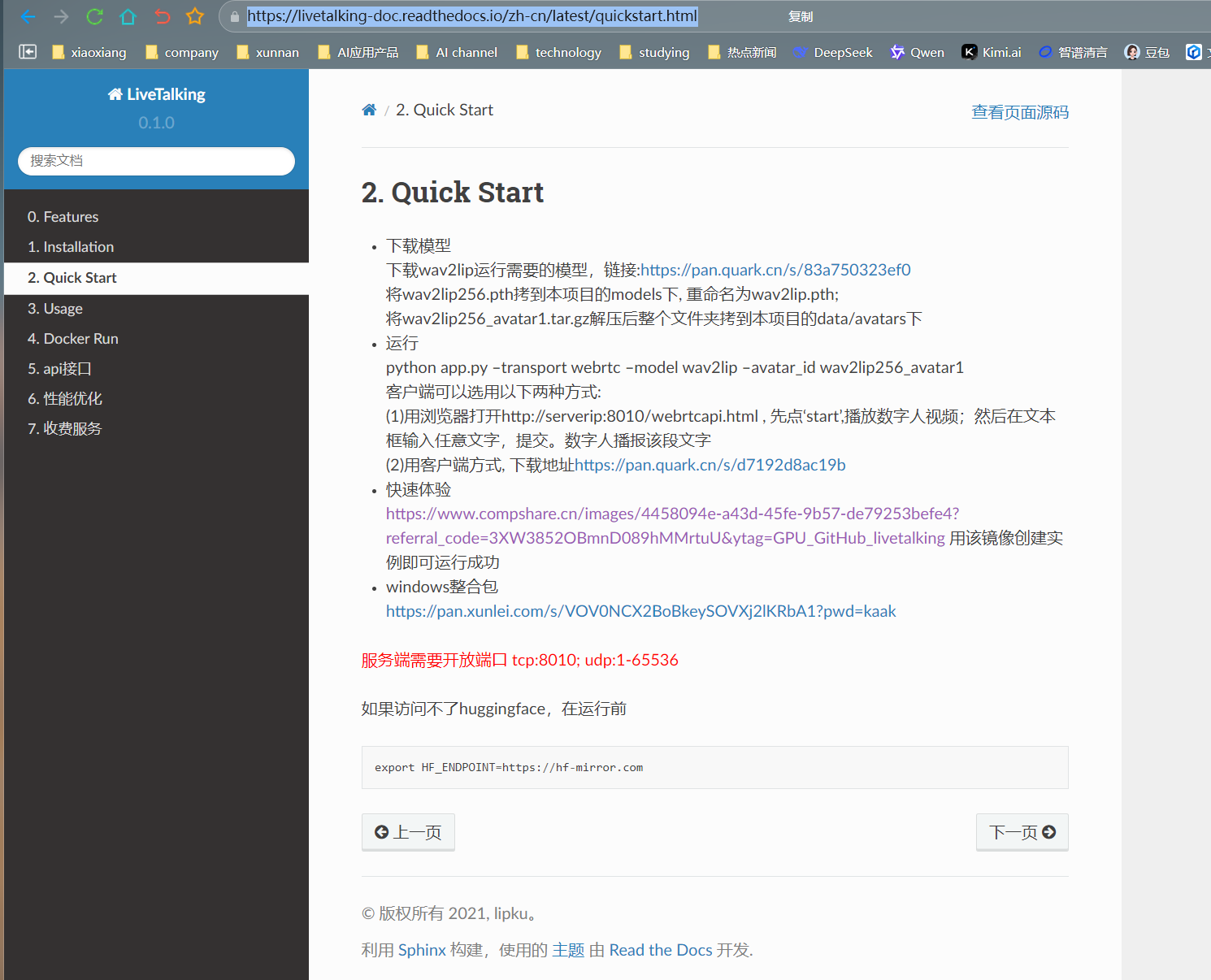 官方文档:官方文档提供了详细的使用说明和技术细节,链接为https://livetalking-doc.readthedocs.io/ 。在搭建和使用 LiveTalking 的过程中,遇到任何问题都可以查阅官方文档来获取解决方案。