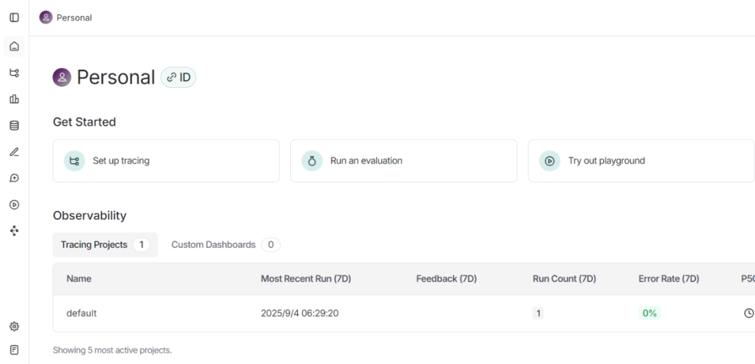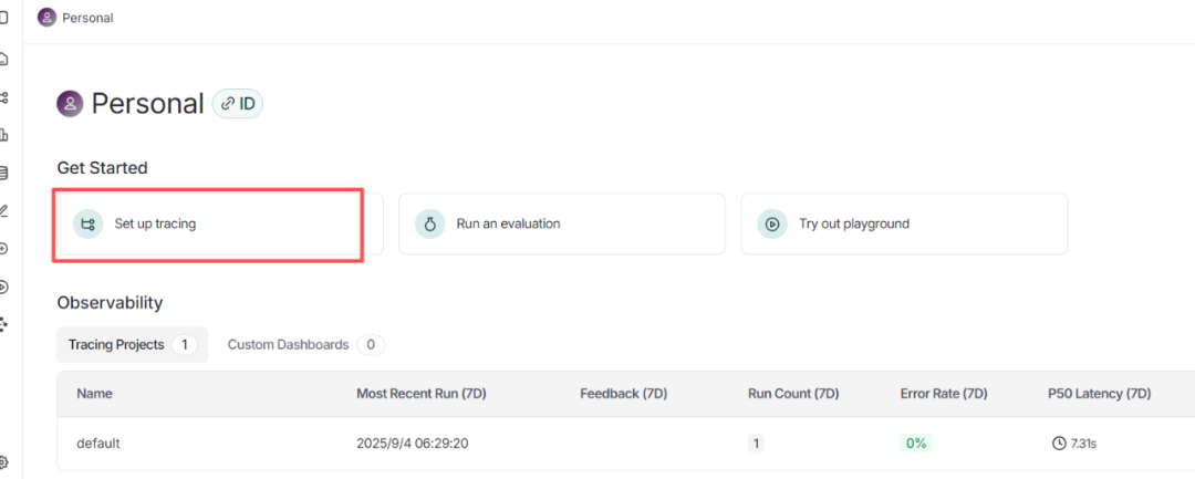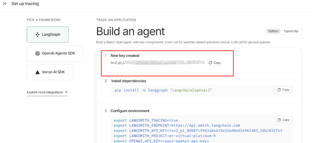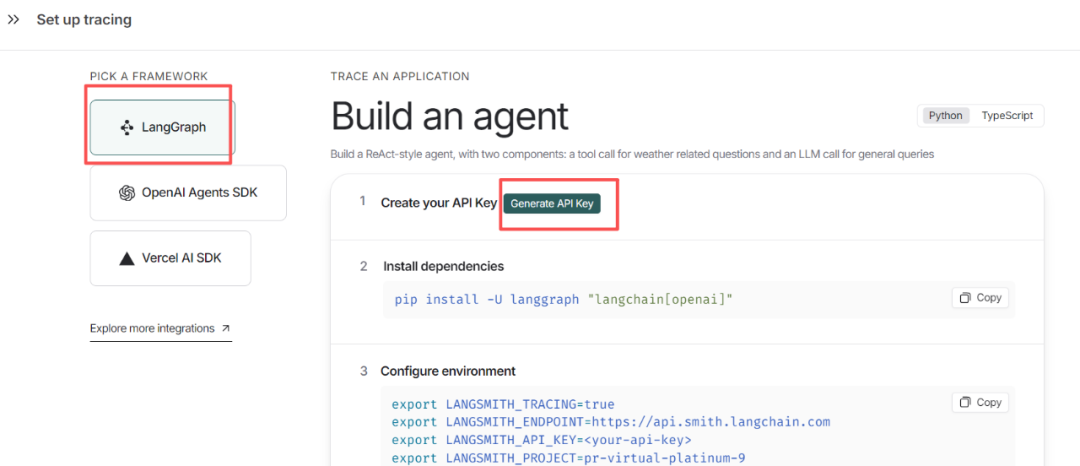 在构建程序跟踪前,首先需要创建一个API密钥,该密钥将允许我们的项目开始向LangSmith发送跟踪数据,按照下图我们首先点击Set up tracing设置追踪按钮,然后选择LangGraph框架,点击Generate API Key生成密钥。创建完密钥后,在后续配置环境变量环节设置开启追踪,并输入密钥即可接入LangSmith。