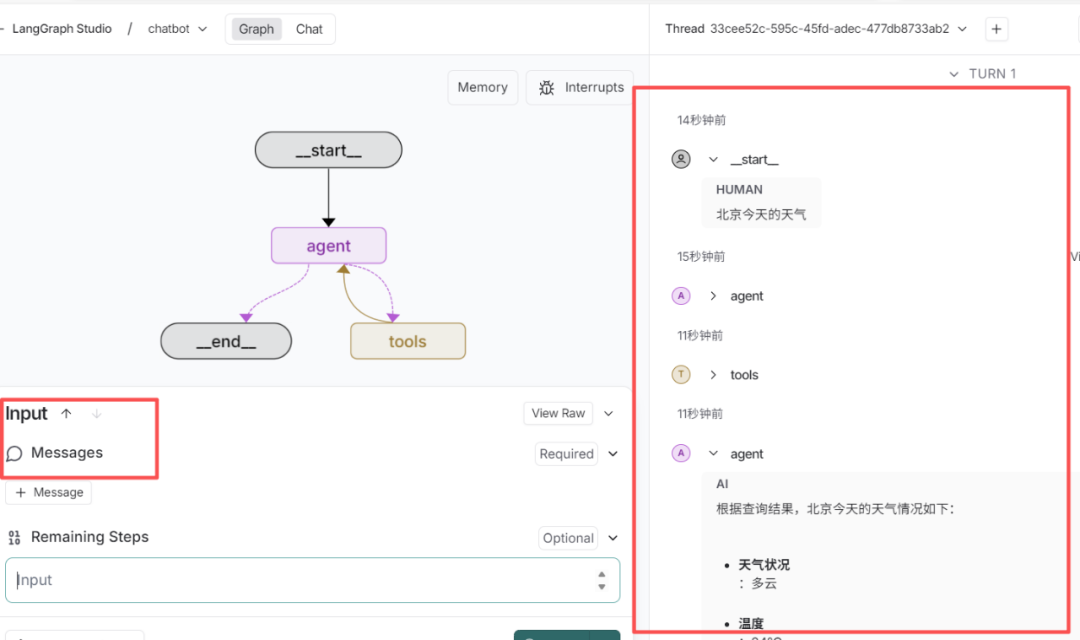我们可以在Input Messages中输入北京今天的天气如何?进行可视化调试:
