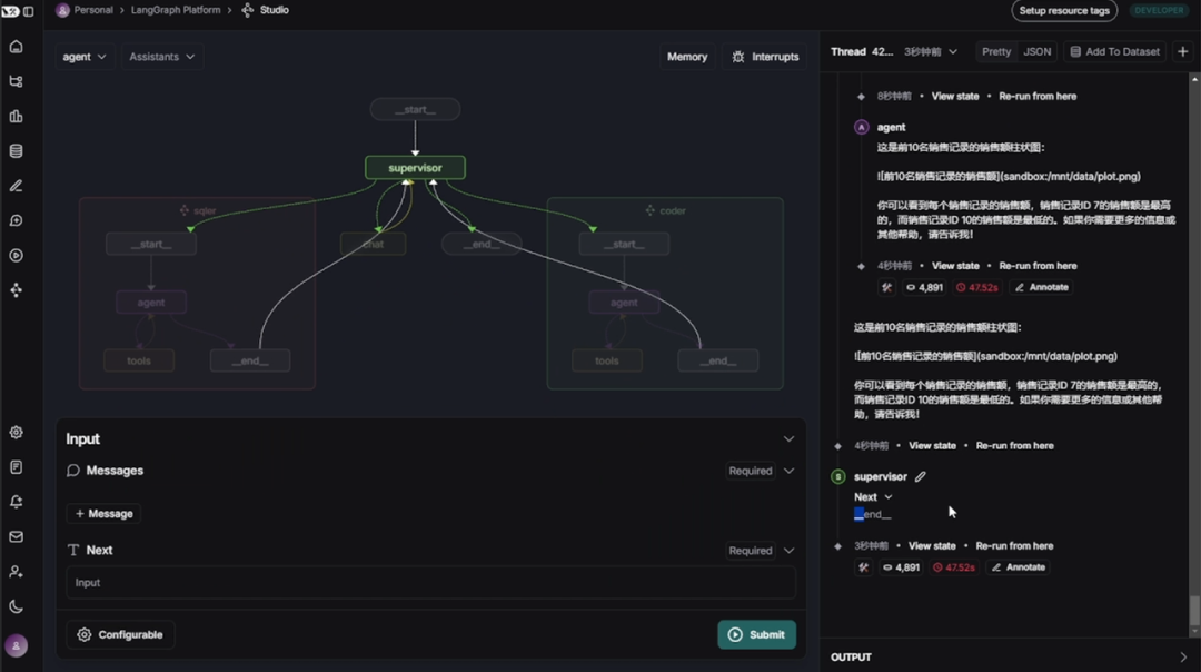 LangGraph Studio是官方专门为LangGraph可视化搭建打造的本地/云端IDE,具备可视化节点和状态、拖拽式搭建、可视化调试、快速部署等功能。LangGraph Studio在本地可视化运行时会自动把调用过程上传到LangSmith;而在LangSmith网页端我们可以追踪任何的日志记录Trace, 又能一键Run in Studio回放整条执行链,所以说LangGraph Studio与LangSmith通过统一的Trace SDK紧密集成。