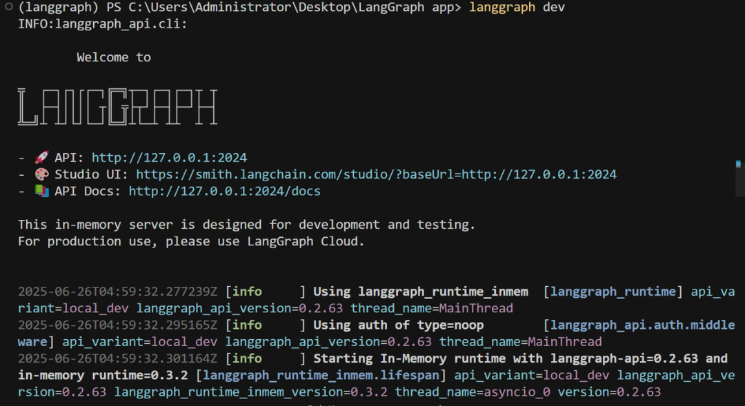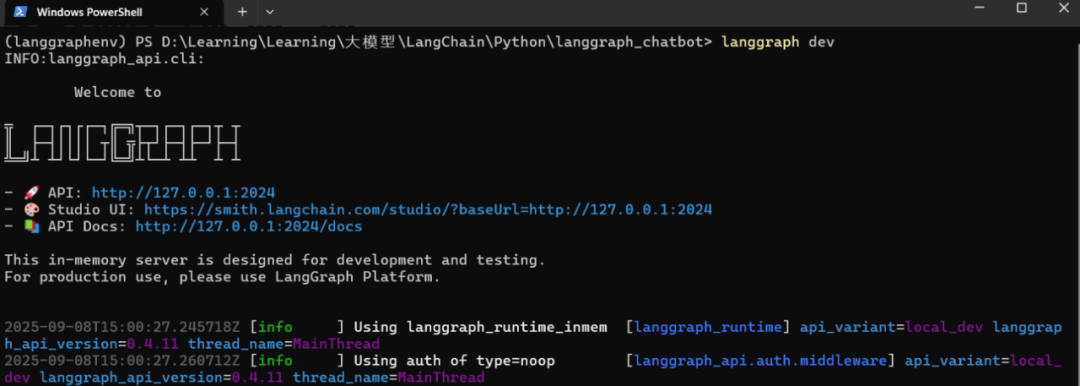最后我们在langgraph_chatbot文件夹下执行langgraph dev命令启动项目,启动之后可以看到三个链接,第一个链接是当前部署完成后的服务端口,第二个是LangGraph Studio的可视化页面,其中第三个端口是端口的说明文档。