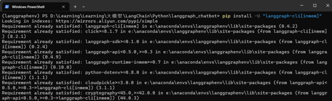 安装langgraph-cli依赖,在anaconda虚拟环境langgraphenv中执行pip install -U "langgraph-cli[inmem]"命令: