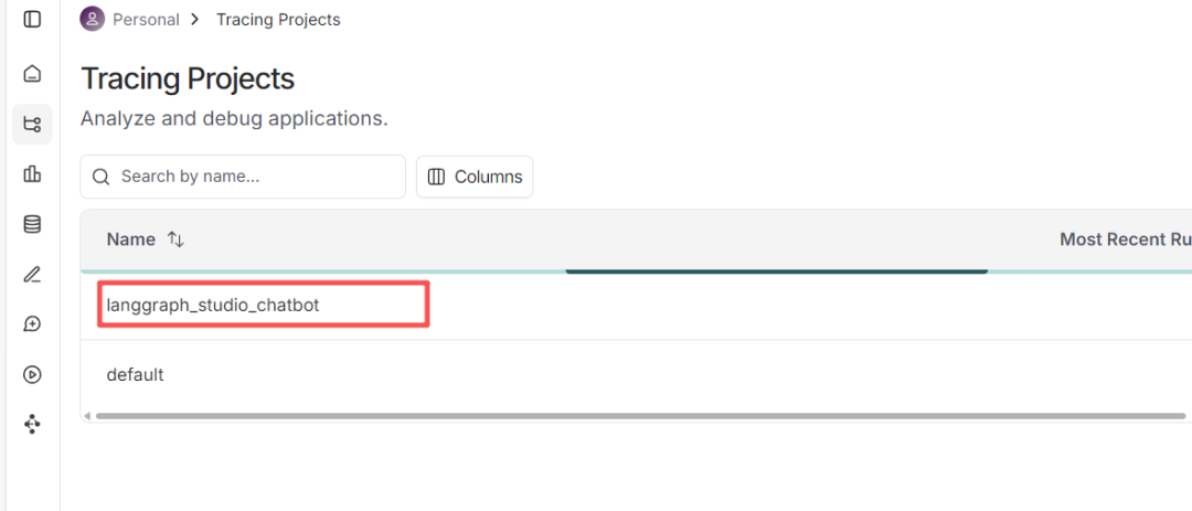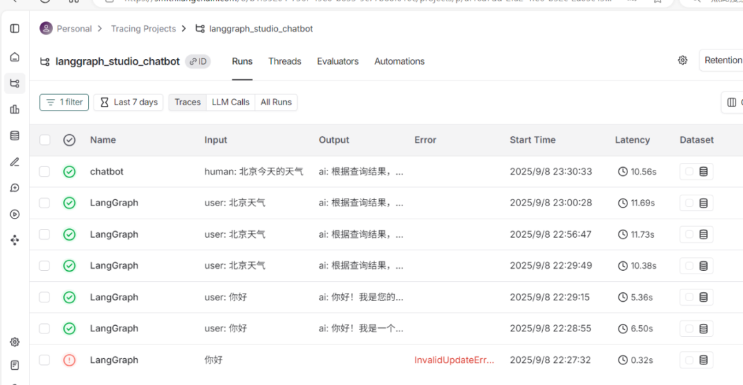 因为我们之前配置时设置了LangSmith追踪,此时可以在LangSmith中查看到当前项目的运行情况,点击LangGraph Studio侧边栏的Tracing Projects按钮,然后点击我们的项目langgraph_studio_chatbot,可以看到LangSmith的调试记录:
