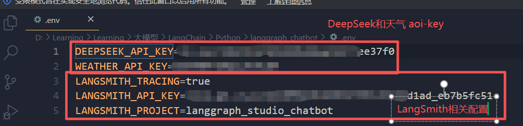 在langgraph_chatbot文件夹中,新建一个.env文件,将敏感信息(如API密钥)放在环境变量中而不是硬编码(注意: 确保字段名称和下方一致,DEEPSEEK_API_KEY和LANGSMITH相关api可以被langgrapn自动识别)。