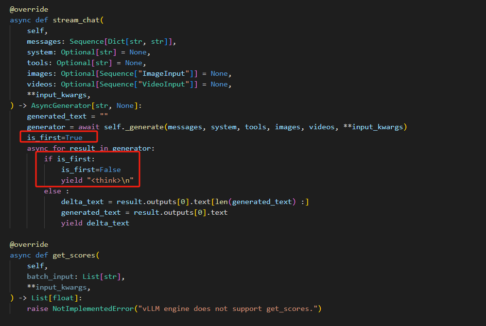 主要思路就是在把对话经过chat_template变成prompt_ids后,给prompt_ids后面加上"<think>\n"对应的词表id。然后再让Vllm去给prompt做续写。