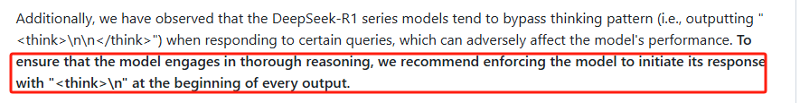 DeepSeek-R1官方仓库也说推荐设置"<think>\n"为开头。