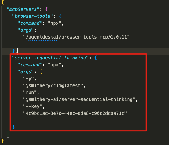 Add new global MCP server进入配置页面, 将👆 Copy 的配置进行粘贴(注意如果已经有mcp配置只需要 复制工具名开始的层级)。