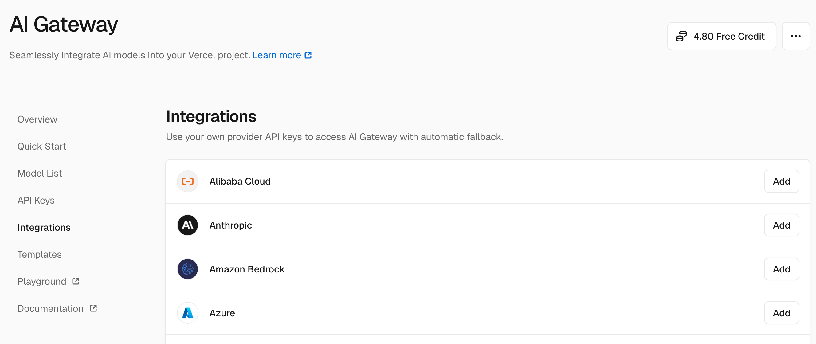 1)Vercel AI Gateway:这是最近很火的一个新产品,最大的特点是上手容易,而且 零加价,如果你使用自己的 API Key,网关本身不收额外费用。适合前端开发者快速搭建全栈 AI 应用。