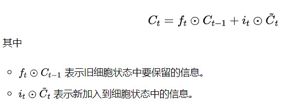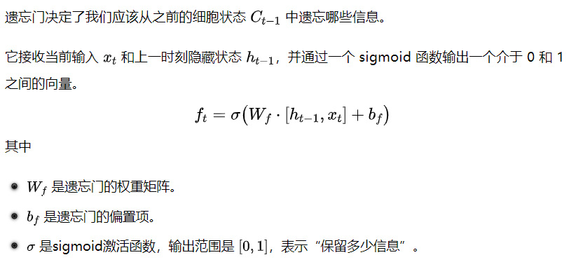 - 遗忘门:决定细胞状态中哪些信息需要被丢弃。