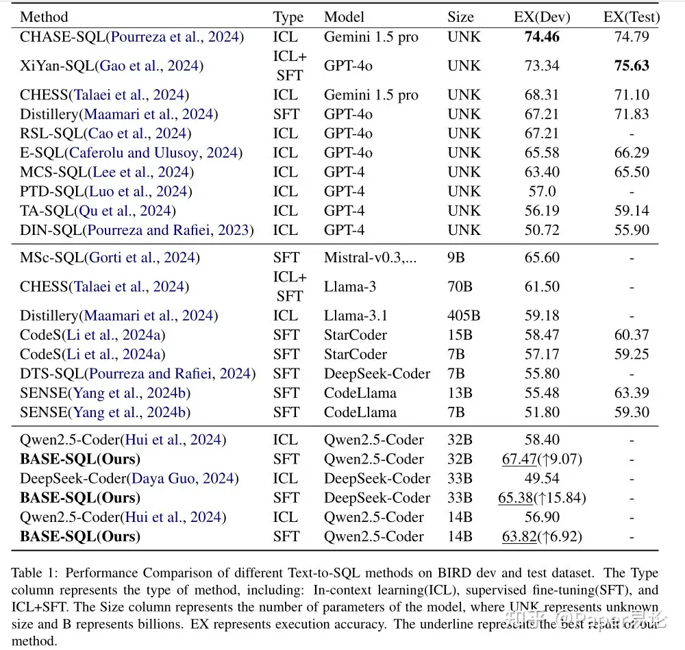 - 我们仅使用两个32B开源模型,在BIRD和Spider数据集上超越了所有其他使用开源模型的方法,甚至超越了几种使用GPT-4o闭源模型的方法。同时,它具有较高的推理效率和较低的复制成本,表明BASE-SQL是一种高性价比的基准方法。我们的源代码将在 https://github.com/CycloneBoy/base_sql 上发布。