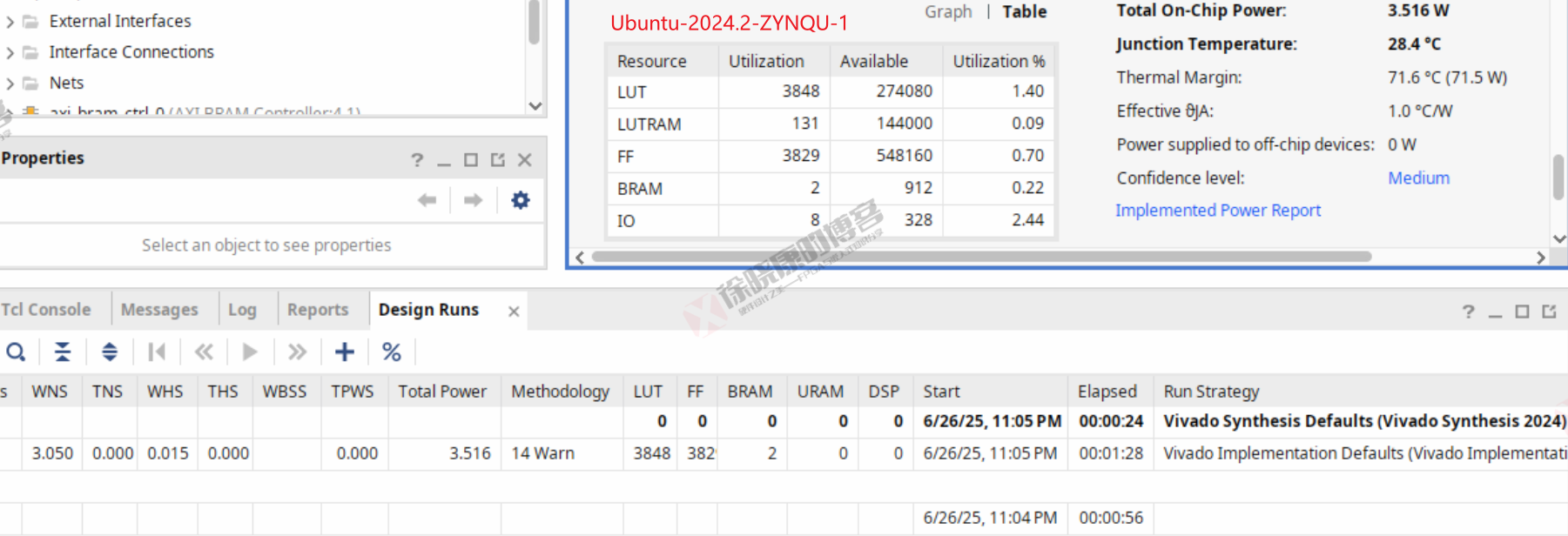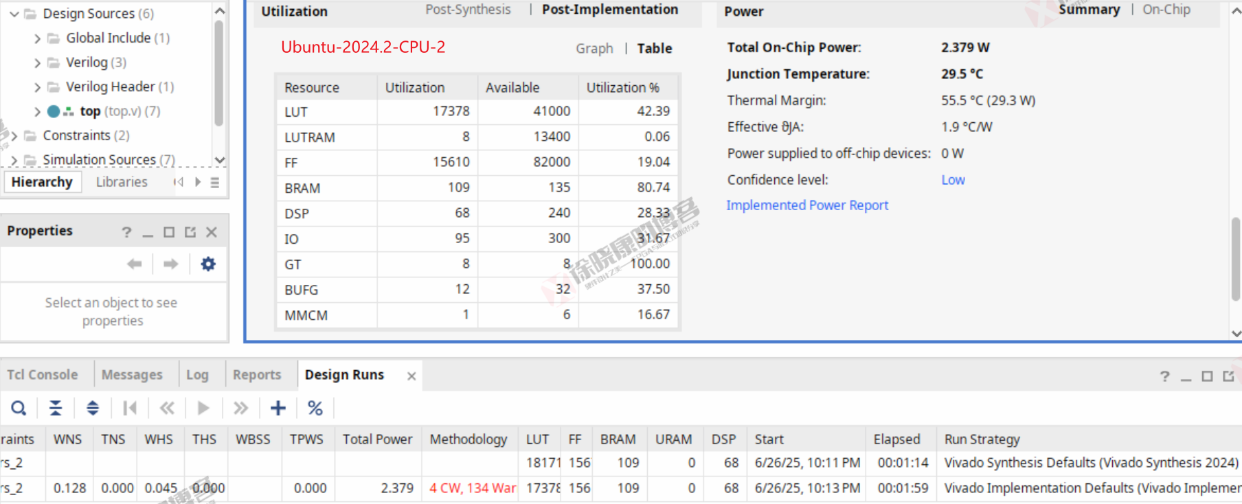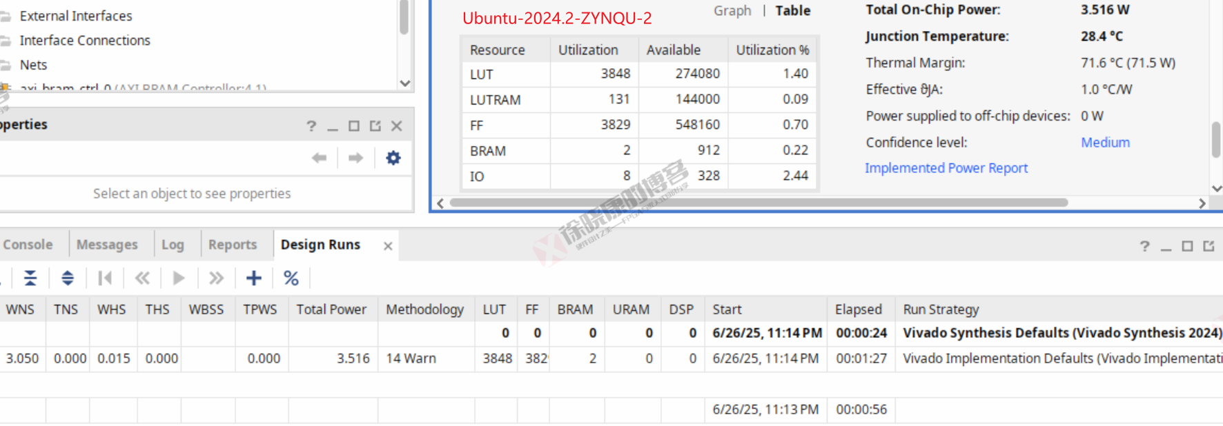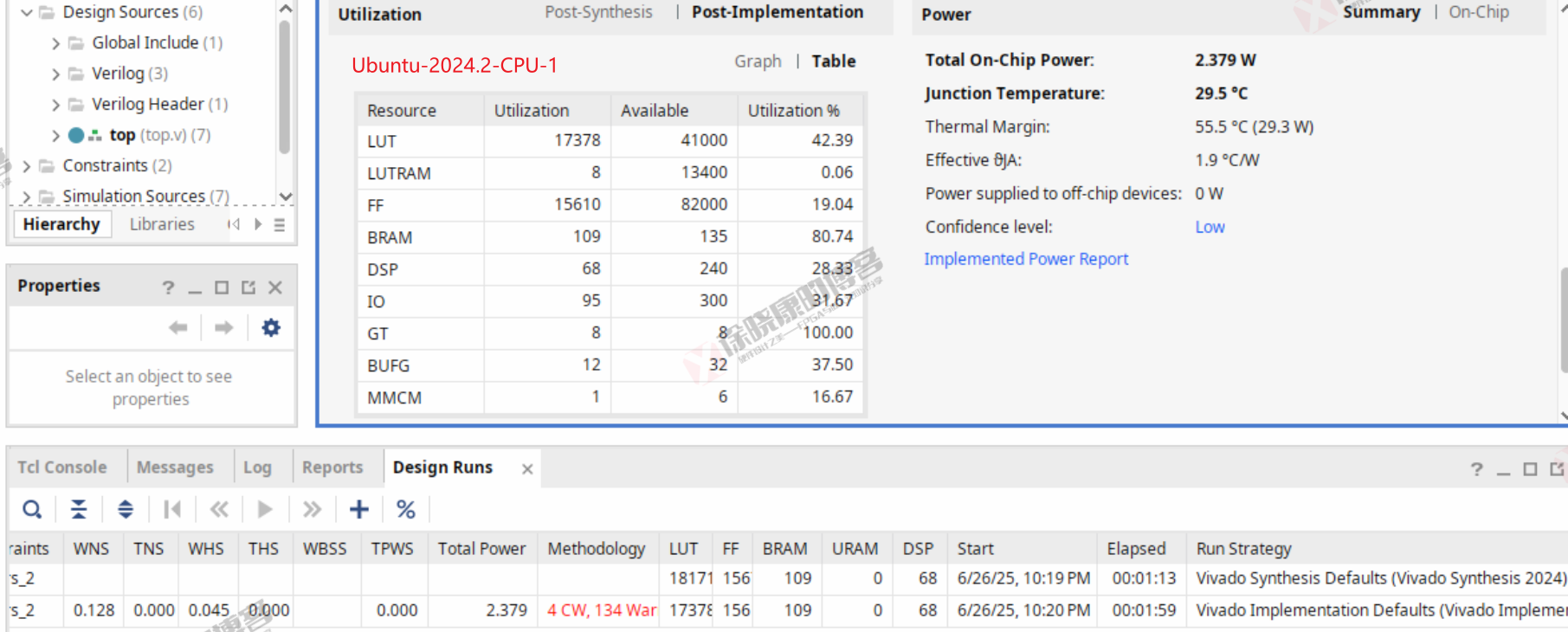 - 当工程较复杂时,Ubuntu下编译更快,大约能缩短22%的编译时间。考虑到本次实验是在虚拟机中运行的Ubuntu,而非实际操作系统,通常来说,实际操作系统性能会更好,所以,实际操作系统的Ubuntu下,Vivado编译时间可能能缩短25%甚至更多。
