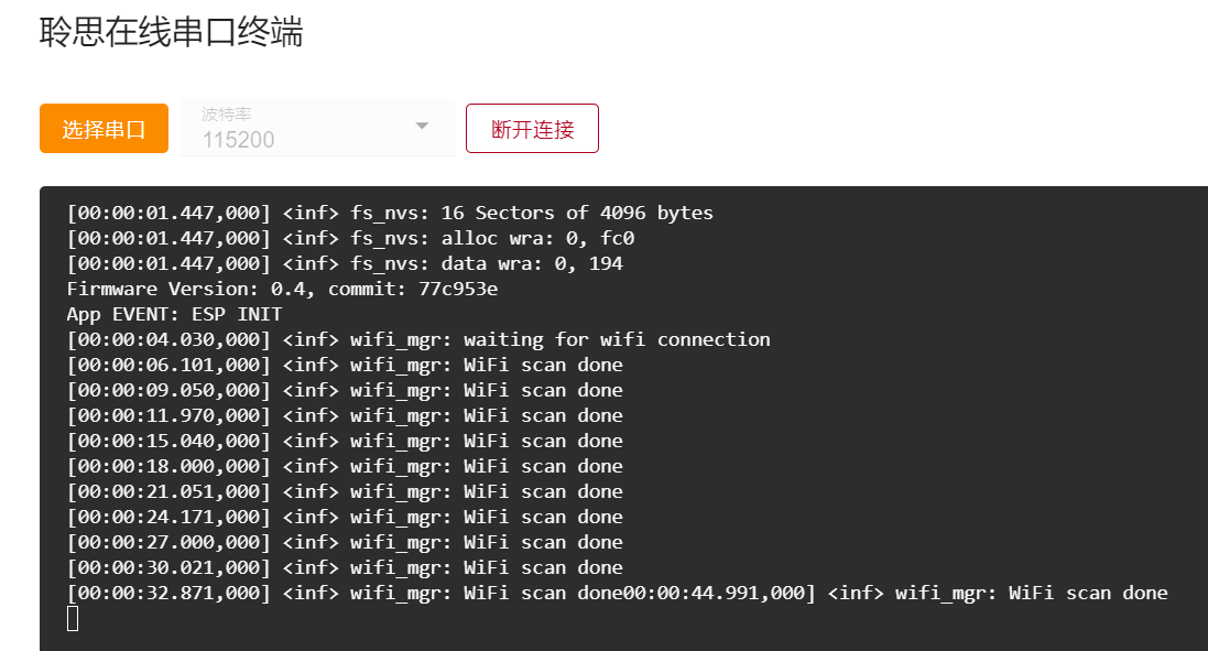 使用数据线连接开发板 DAP_USB 接口后,打开聆思在线串口终端,选择对应的串口设备进行连接,波特率默认 115200,完成配置后点击连接按钮。