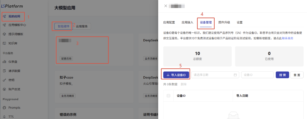 聆思平台只会对列表中的设备鉴权提供交互服务,因此需要将前面读取到的设备 ID 在设备管理页面进行导入才能实现设备正常交互。