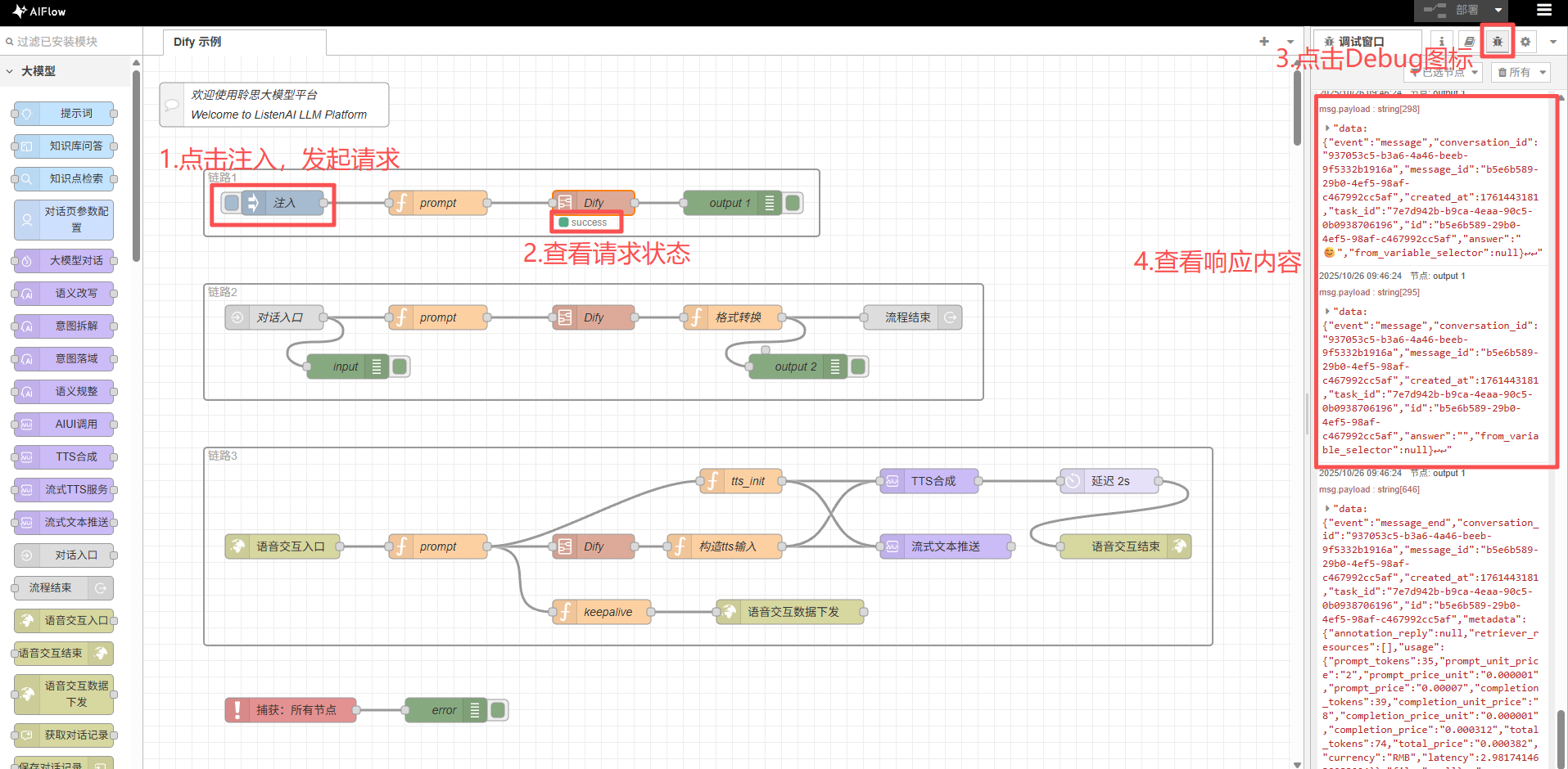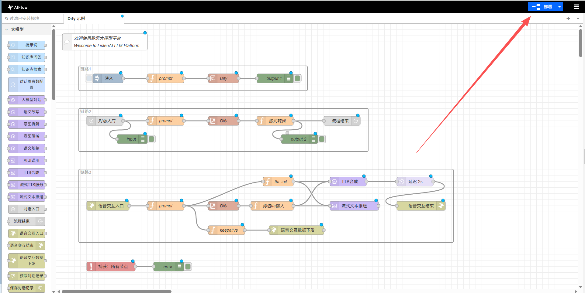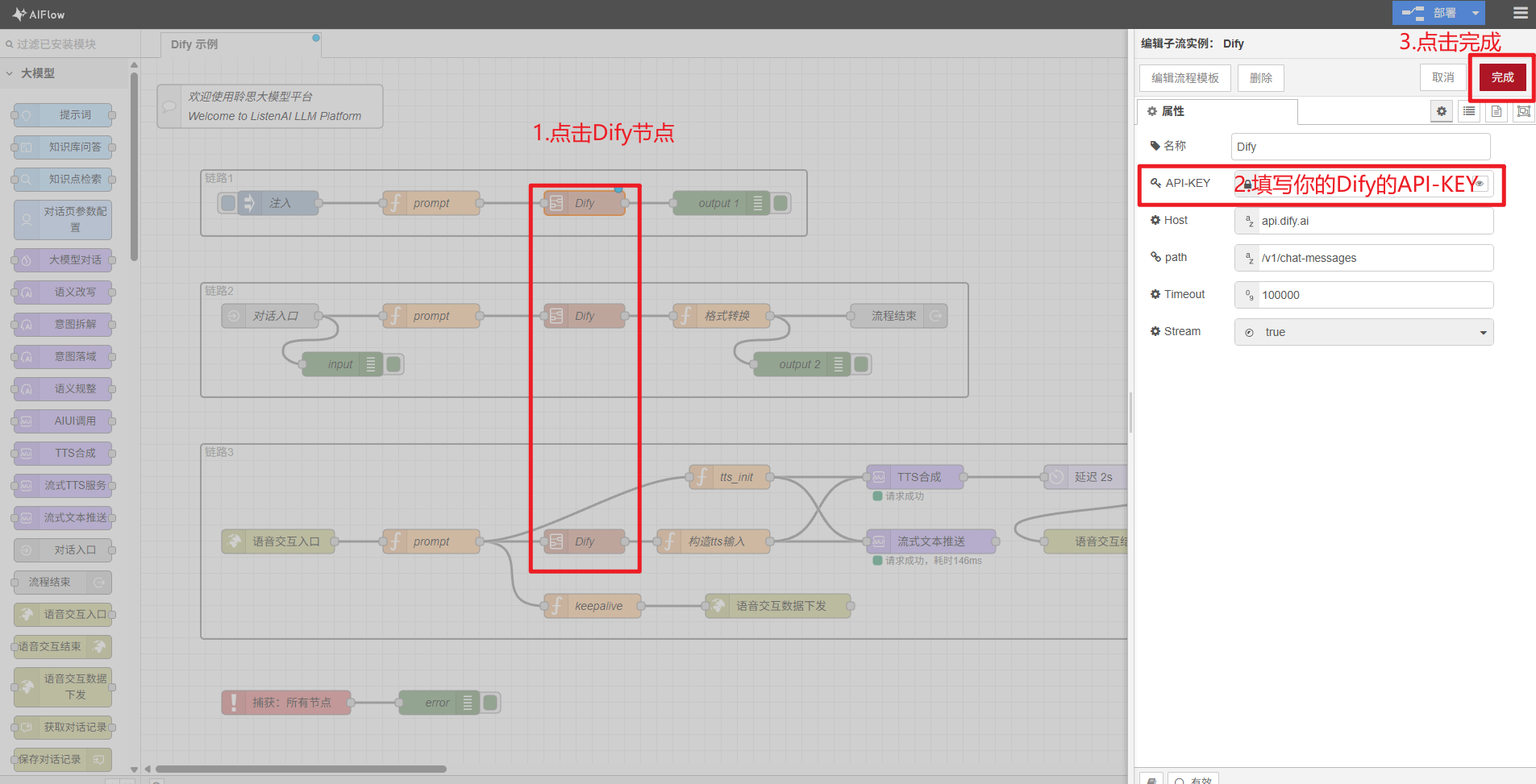 - 链路 3: 可通过开发板调用 Dify 节点,最终将大模型输出的结果进行语音合成实现端侧播报。