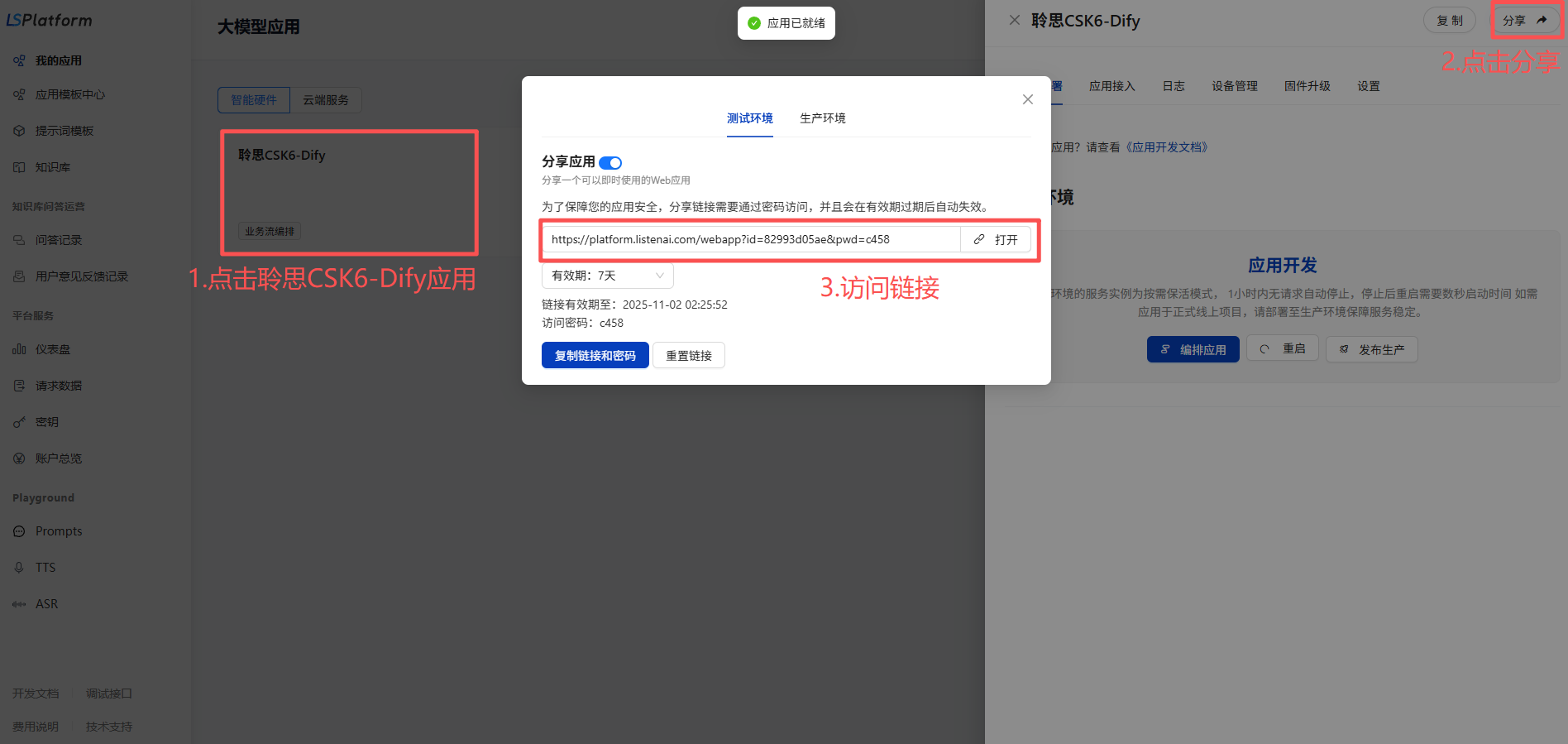 回到【我的应用】,双击聆思 CSK6-Dify 应用,在弹出的应用详情页面点击右上角分享按钮打开 web 验证配置,该配置页包含测试地址和访问密码。