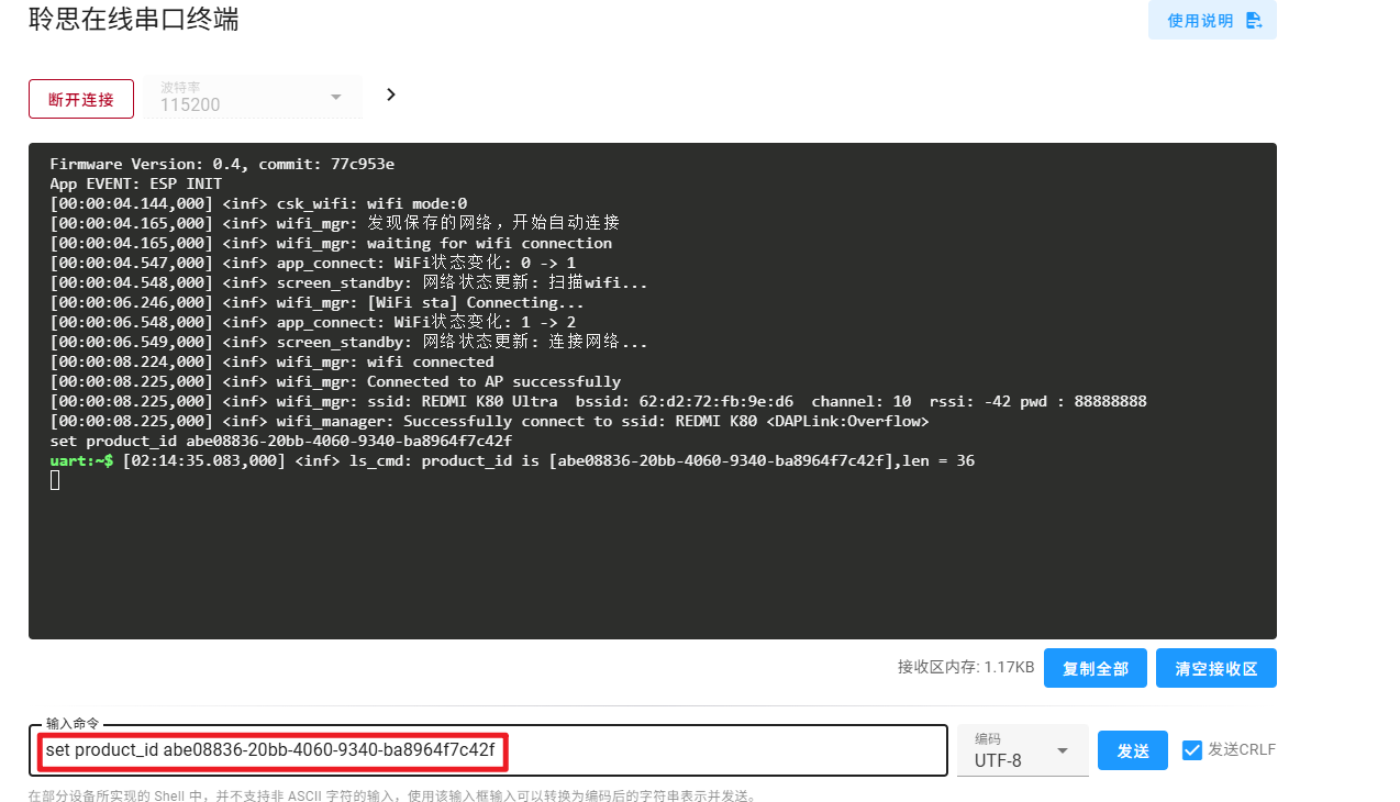 通过 set product_id 和 set secret_id 指令可以分别配置开发板接入的大模型应用 product ID 及其密钥,示例如下:
