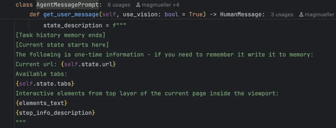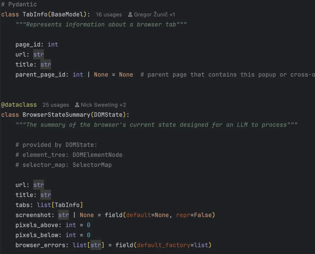 下面,一个是需要注意这里设计了一个 BrowserStateSummary 的数据模型给 LLM 去处理,它记录了 browser 当前的状态信息,包括打开了哪些标签页,当前所在的页面等等。