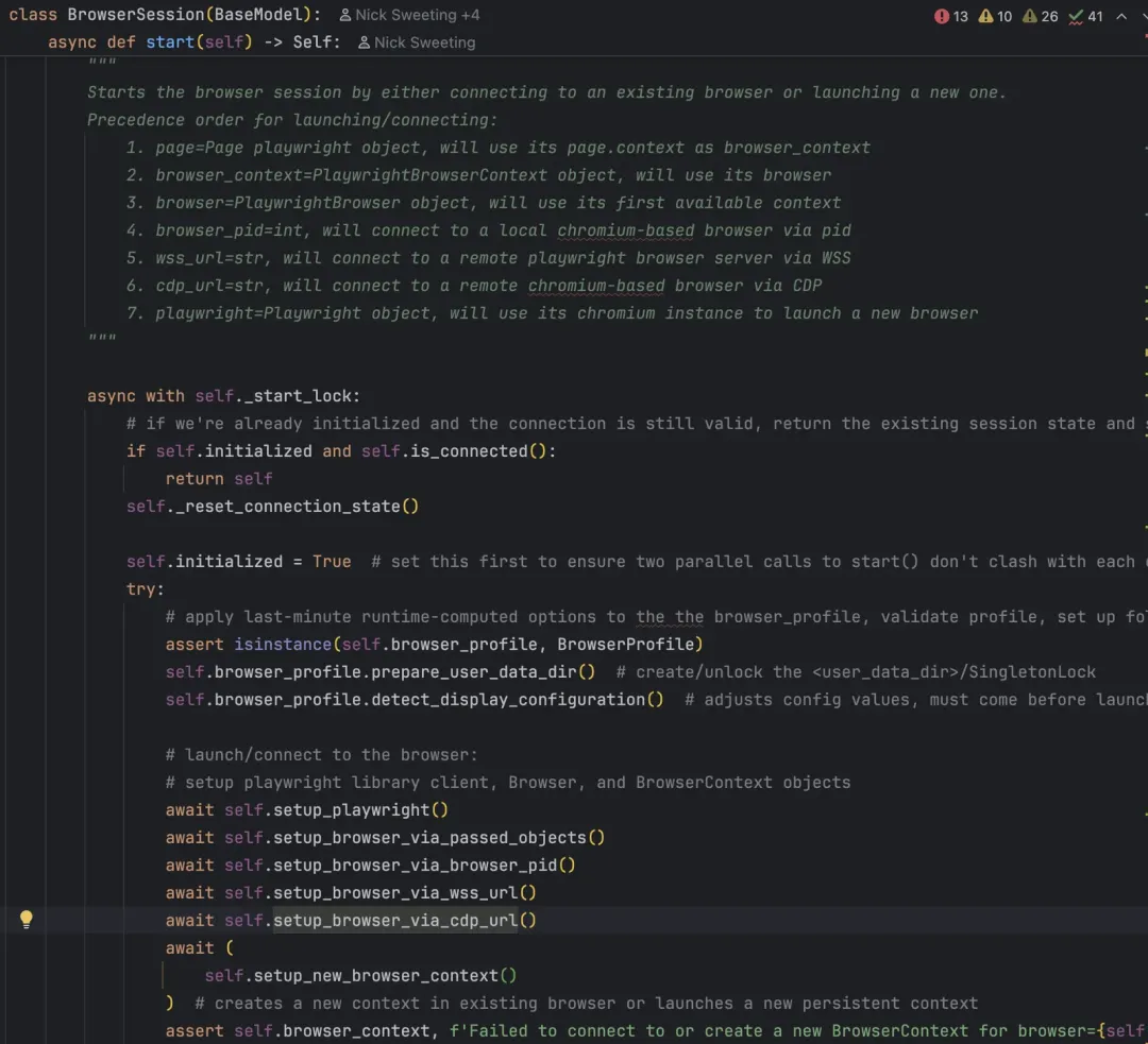BrowserSession 类这里可以看到,通过连接现有浏览器或启动新浏览器来启动浏览器会话。我们后面实战过程中,其实就是通过 cdp 协议连接到了远程服务器的 browser 实例,从而实现访问外部网站的能力。