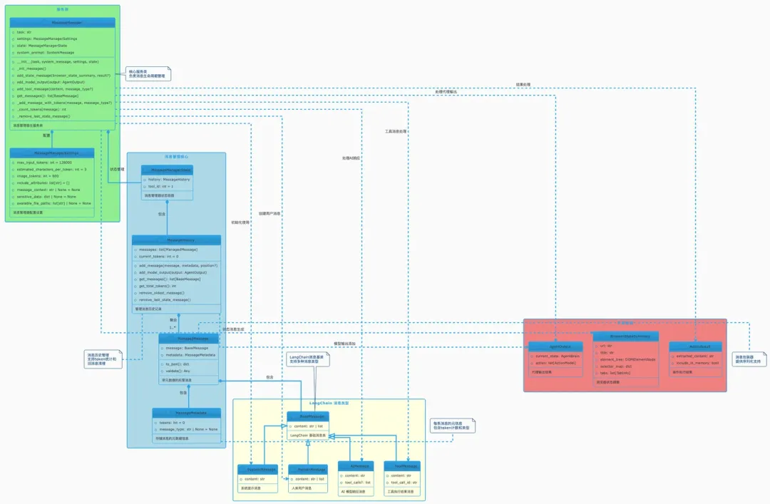 - message_manager 模块:管理大模型交互过程中所有通信内容,包括系统提示词、用户输入、模型输出、工具输出等;