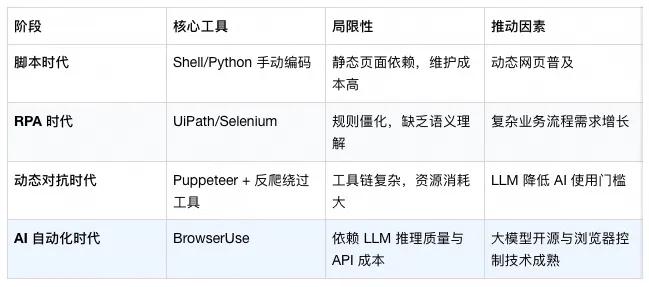 在 BrowserUse 等 AI 驱动的浏览器自动化工具出现之前,传统 RPA(Robotic Process Automation)、爬虫框架和自动化测试工具已长期服务于数据抓取、页面操作模拟等场景,下面从技术发展历史角度,分阶段解析这些需求的实现方式及演变逻辑。